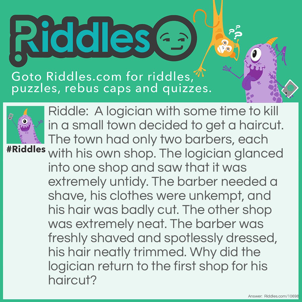 Riddle: A logician with some time to kill in a small town decided to get a haircut. The town had only two barbers, each with his own shop. The logician glanced into one shop and saw that it was extremely untidy. The barber needed a shave, his clothes were unkempt, and his hair was badly cut. The other shop was extremely neat. The barber was freshly shaved and spotlessly dressed, his hair neatly trimmed. Why did the logician return to the first shop for his haircut?