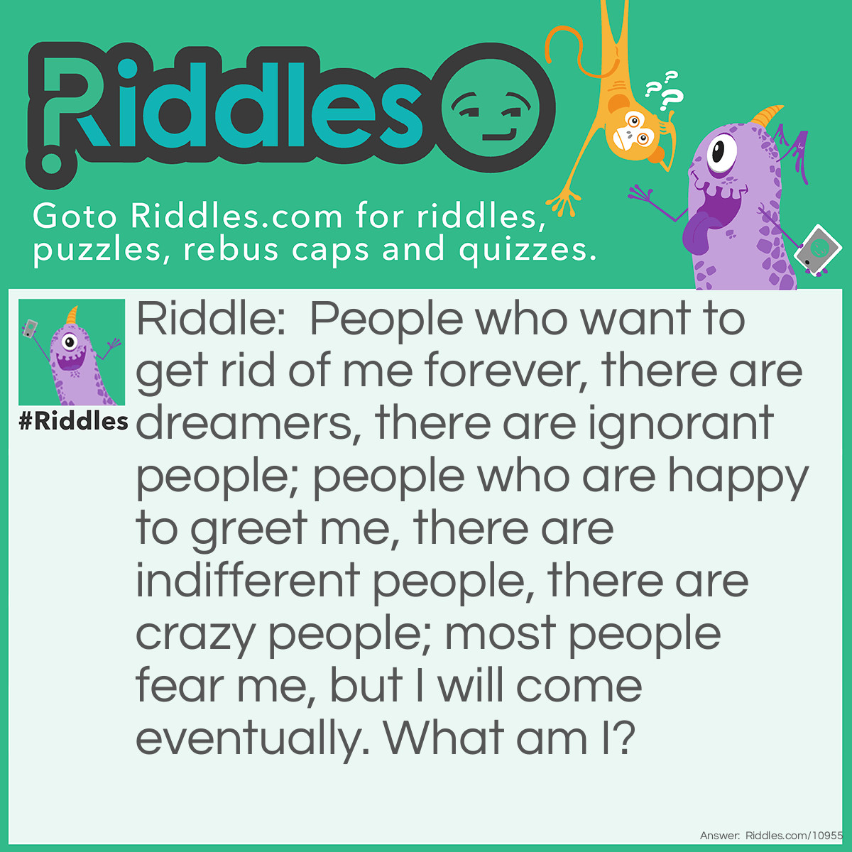 Riddle: People who want to get rid of me forever, there are dreamers, there are ignorant people; people who are happy to greet me, there are indifferent people, there are crazy people; most people fear me, but I will come eventually. What am I?