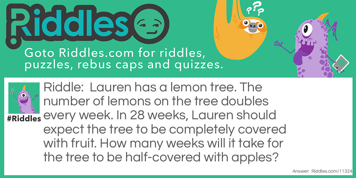 Riddle: Lauren has a lemon tree. The number of lemons on the tree doubles every week. In 28 weeks, Lauren should expect the tree to be completely covered with fruit. How many weeks will it take for the tree to be half-covered with apples?