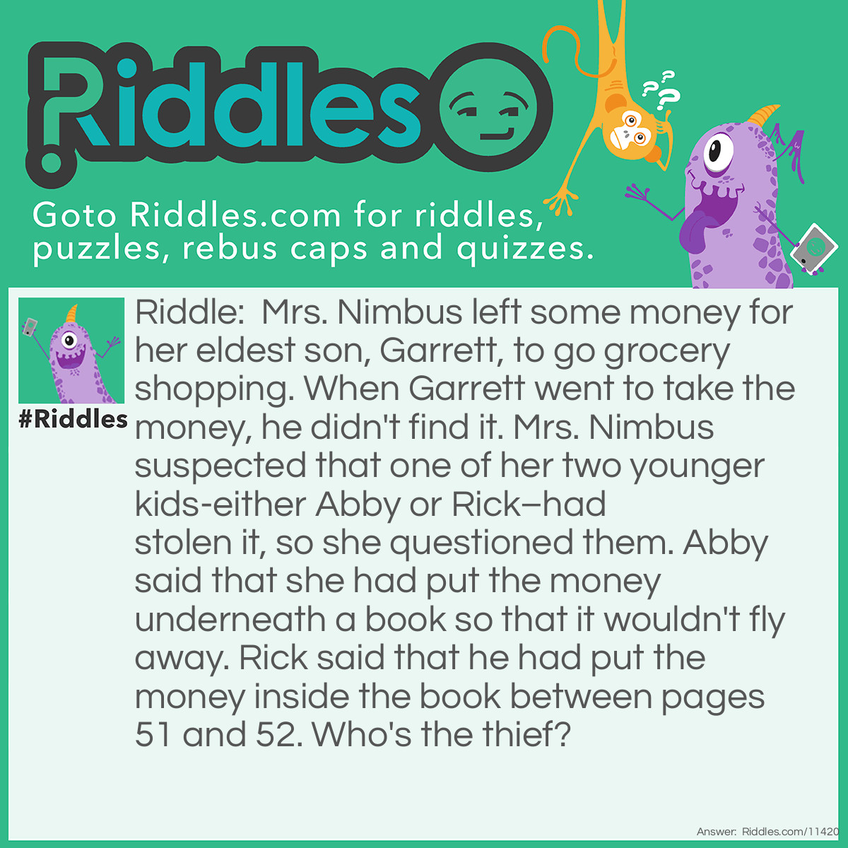 Riddle: Mrs. Nimbus left some money for her eldest son, Garrett, to go grocery shopping. When Garrett went to take the money, he didn't find it. Mrs. Nimbus suspected that one of her two younger kids-either Abby or Rick–had stolen it, so she questioned them. Abby said that she had put the money underneath a book so that it wouldn't fly away. Rick said that he had put the money inside the book between pages 51 and 52. Who's the thief?