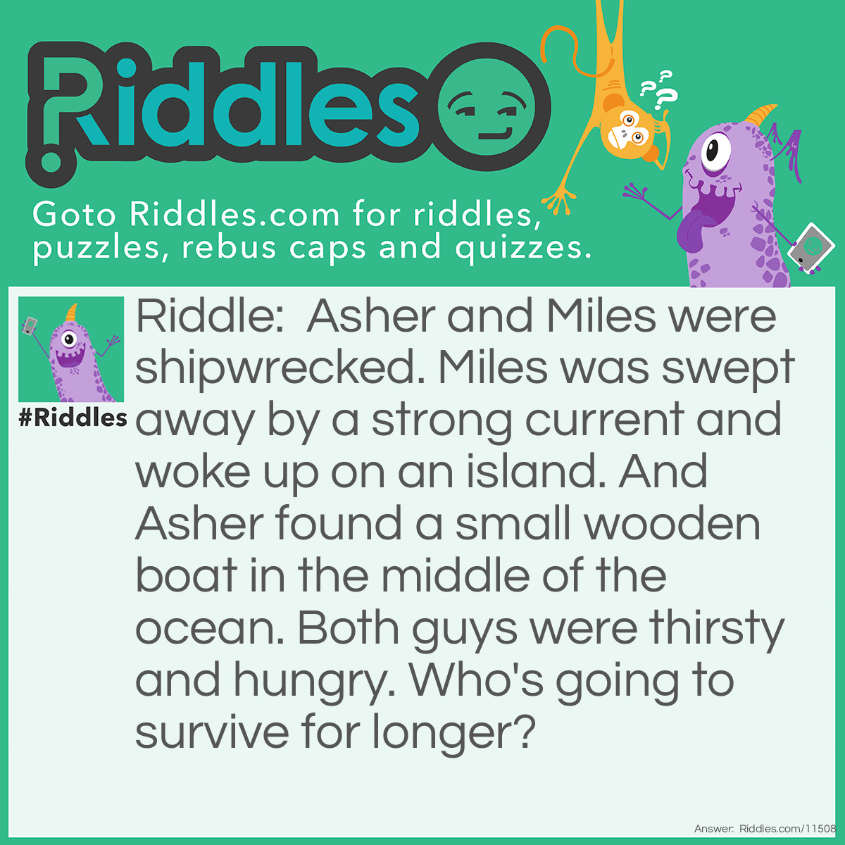 Riddle: Asher and Miles were shipwrecked. Miles was swept away by a strong current and woke up on an island. And Asher found a small wooden boat in the middle of the ocean. Both guys were thirsty and hungry. Who's going to survive for longer?