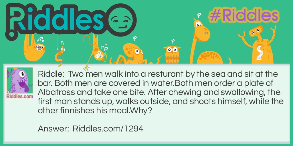 Riddle: Two men walk into a restaurant by the sea and sit at the bar. Both men are covered in water. Both men order a plate of Albatross and take one bite. After chewing and swallowing, the first man stands up, walks outside, and shoots himself, while the other finnishes his meal. Why?