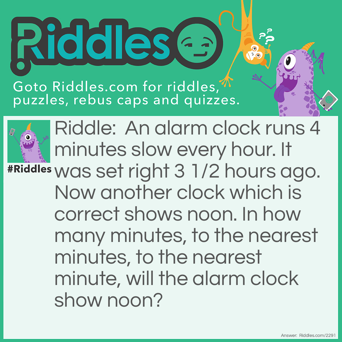 Riddle: An alarm clock runs 4 minutes slow every hour. It was set right 3 1/2 hours ago. Now another clock which is correct shows noon.