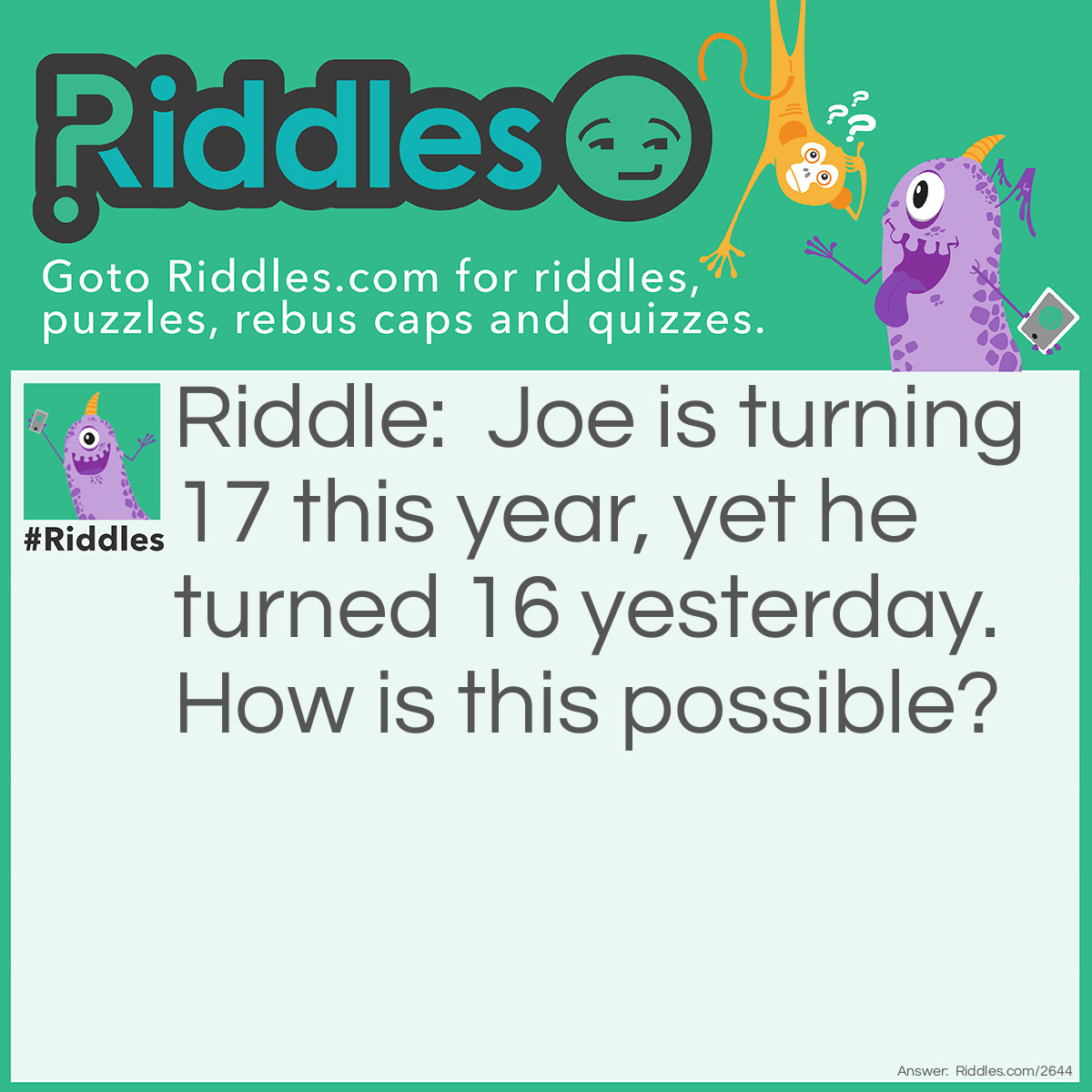 Riddle: Joe is turning 17 this year, yet he turned 16 yesterday. How is this possible?