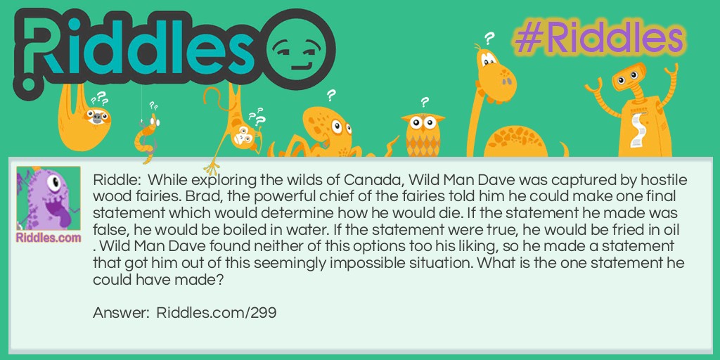 Riddle: While exploring the wilds of Canada, Wild Man Dave was captured by hostile wood fairies. Brad, the powerful chief of the fairies told him he could make one final statement that would determine how he would die. If the statement he made was false, he would be boiled in water. If the statement were true, he would be fried in oil. Wild Man Dave found neither of these options to his liking, so he made a statement that got him out of this seemingly impossible situation. What is the one statement he could have made?