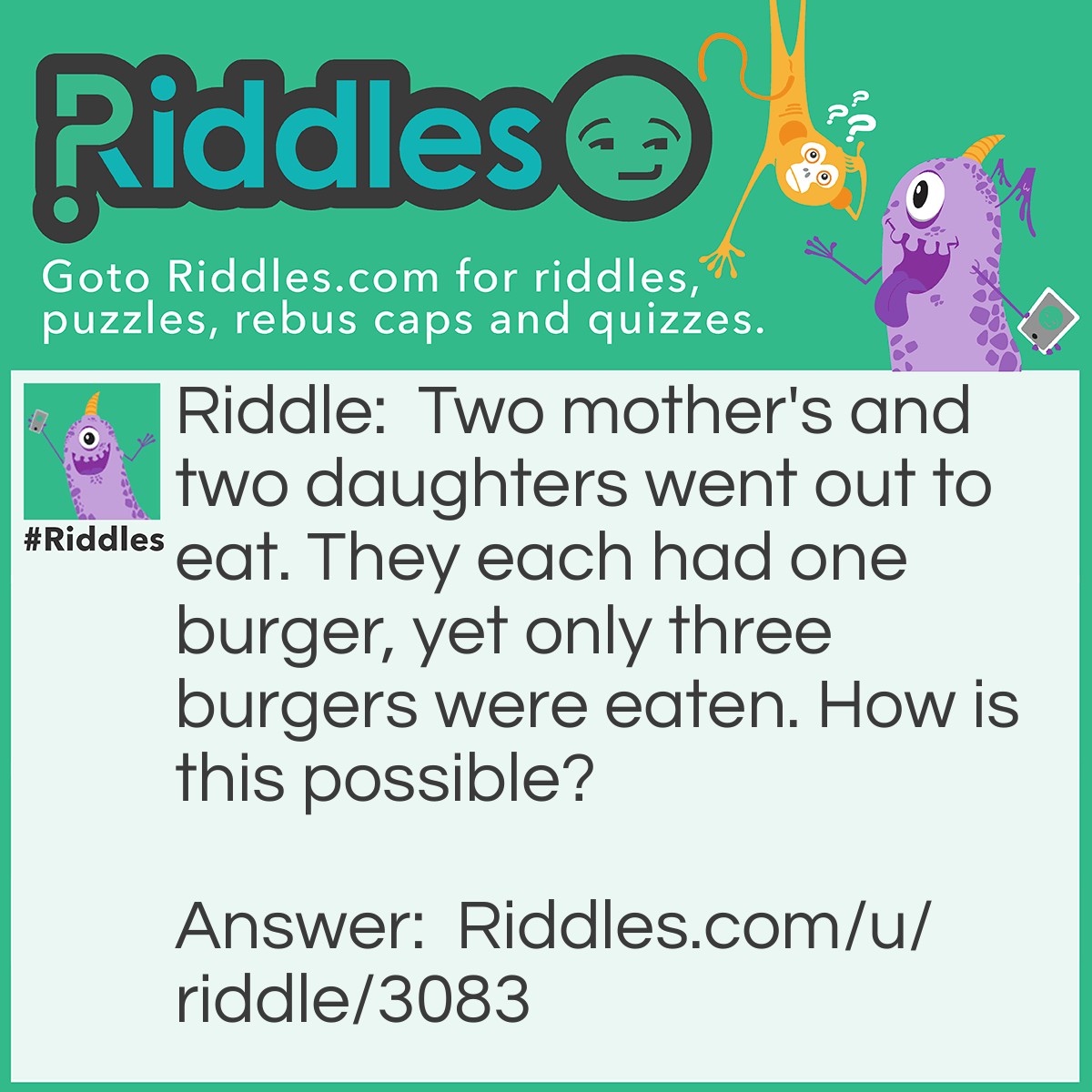 Riddle: Two mother's and two daughters went out to eat. They each had one burger, yet only three burgers were eaten. How is this possible?