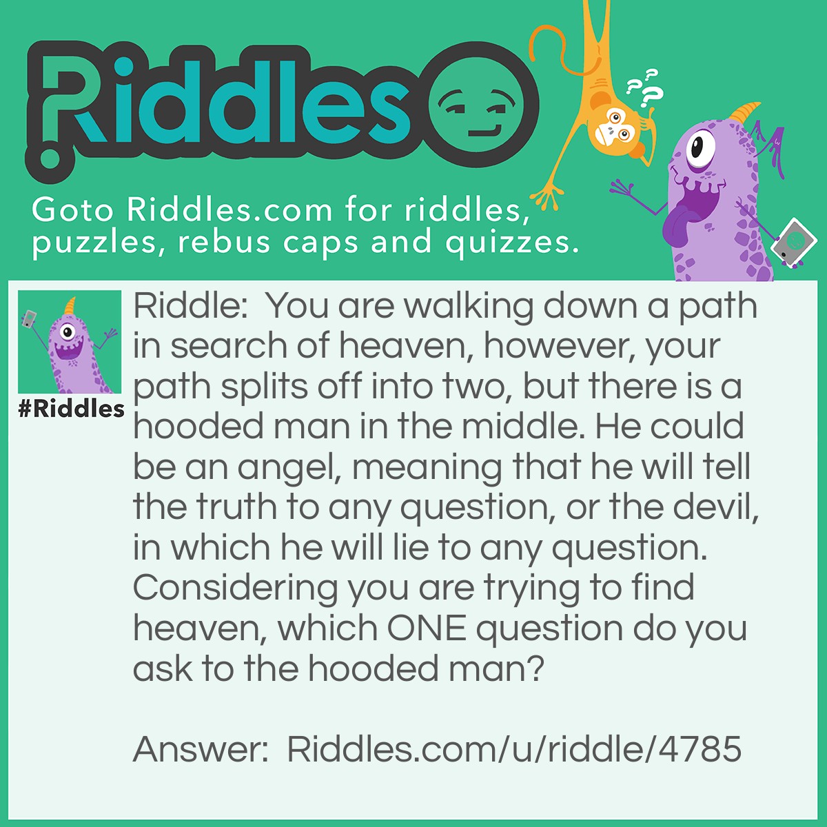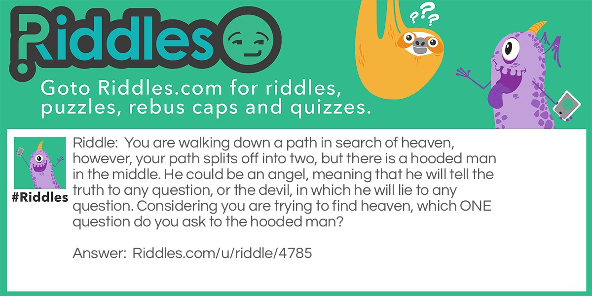 Riddle: You are walking down a path in search of heaven, however, your path splits off into two, but there is a hooded man in the middle. He could be an angel, meaning that he will tell the truth to any question, or the devil, in which he will lie to any question. Considering you are trying to find heaven, which ONE question do you ask to the hooded man?