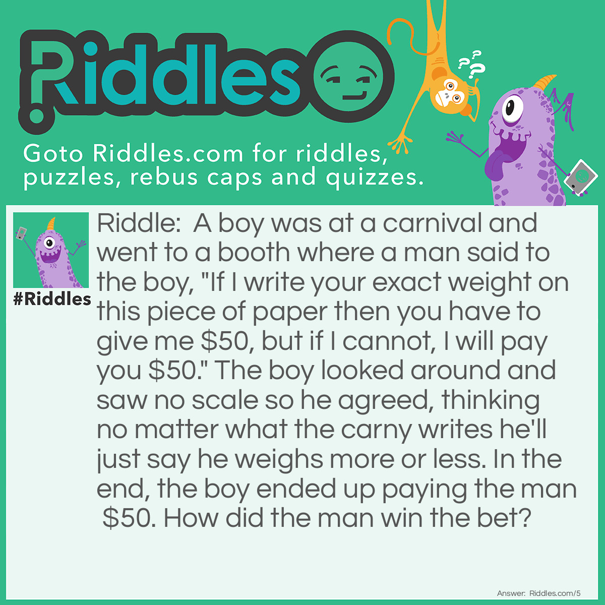 Riddle: A boy was at a carnival and went to a booth where a man said to the boy, "If I write your exact weight on this piece of paper then you have to give me $50, but if I cannot, I will pay you $50." The boy looked around and saw no scale so he agreed, thinking no matter what the carny writes he'll just say he weighs more or less. In the end, the boy ended up paying the man $50. How did the man win the bet?