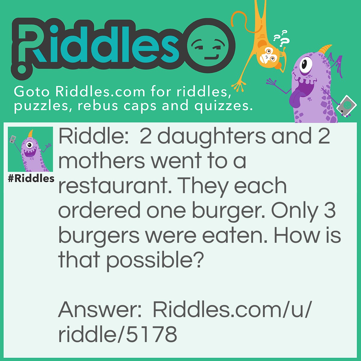 Riddle: 2 daughters and 2 mothers went to a restaurant. They each ordered one burger. Only 3 burgers were eaten. How is that possible?