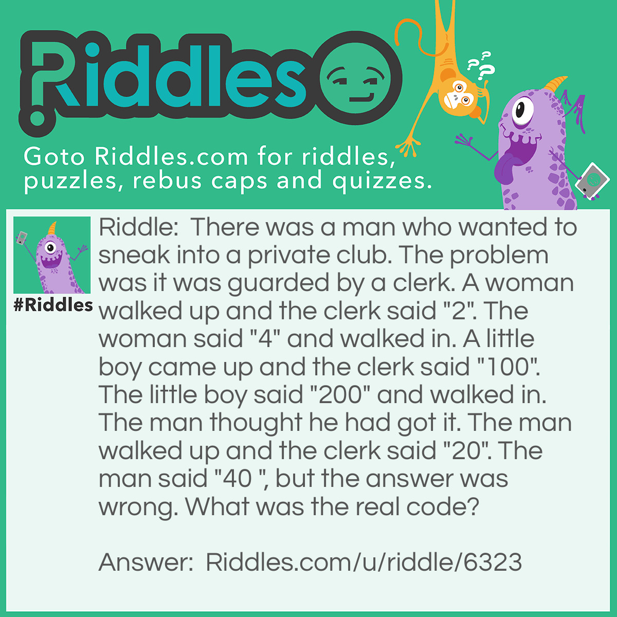 Riddle: There was a man who wanted to sneak into a private club. The problem was it was guarded by a clerk. A woman walked up and the clerk said "2". The woman said "4" and walked in. A little boy came up and the clerk said "100".The little boy said "200" and walked in. The man thought he had got it. The man walked up and the clerk said "20". The man said "40 ", but the answer was wrong. What was the real code?