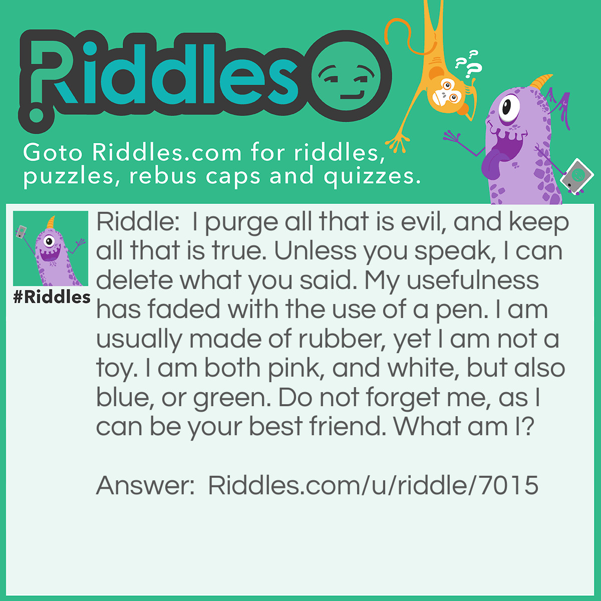 Riddle: I purge all that is evil and keep all that is true. Unless you speak, I can delete what you said. My usefulness has faded with the use of a pen. I am usually made of rubber, yet I am not a toy. I am both pink, and white, but also blue, or green. Do not forget me, as I can be your best friend. What am I?