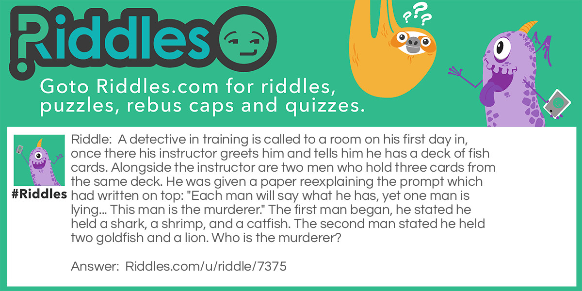 Riddle: A detective in training is called to a room on his first day in, once there his instructor greets him and tells him he has a deck of fish cards. Alongside the instructor are two men who hold three cards from the same deck. He was given a paper reexplaining the prompt which had written on top: "Each man will say what he has, yet one man is lying... This man is the murderer." The first man began, he stated he held a shark, a shrimp, and a catfish. The second man stated he held two goldfish and a lion. Who is the murderer?