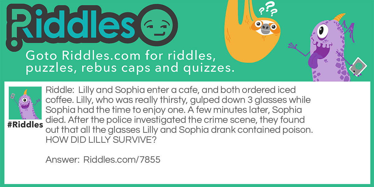 Riddle: Lilly and Sophia enter a cafe, and both ordered iced coffee. Lilly, who was really thirsty, gulped down 3 glasses while Sophia had the time to enjoy one. A few minutes later, Sophia died. After the police investigated the crime scene, they found out that all the glasses Lilly and Sophia drank contained poison. HOW DID LILLY SURVIVE?