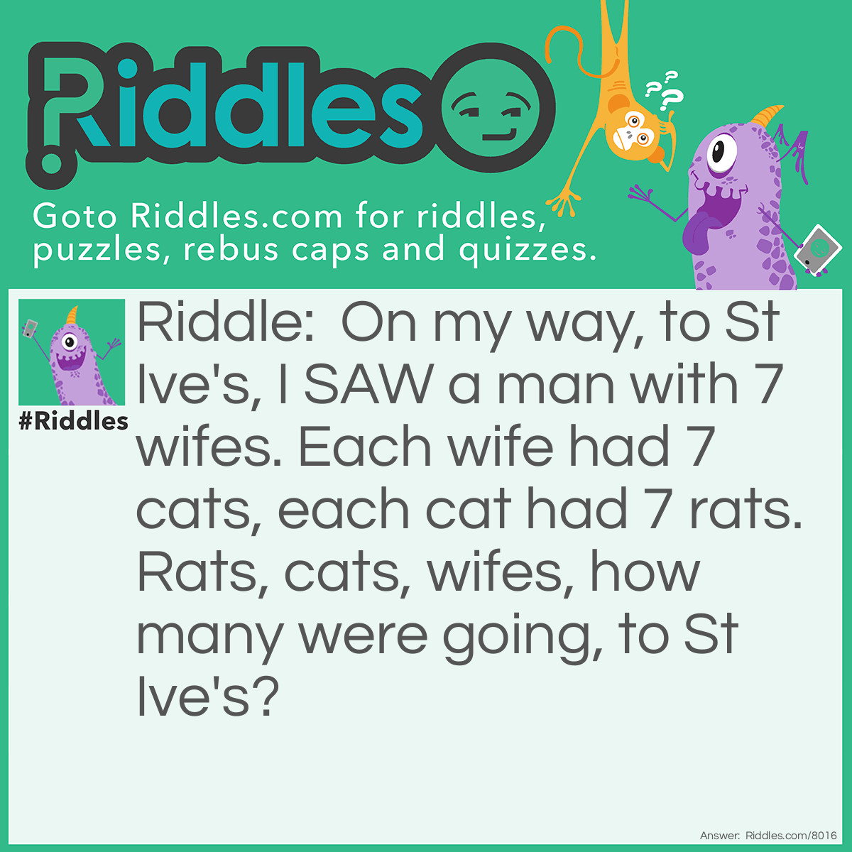Riddle: On my way, to St Ive's, I SAW a man with 7 wifes. Each wife had 7 cats, each cat had 7 rats. Rats, cats, wifes, how many were going, to St Ive's?