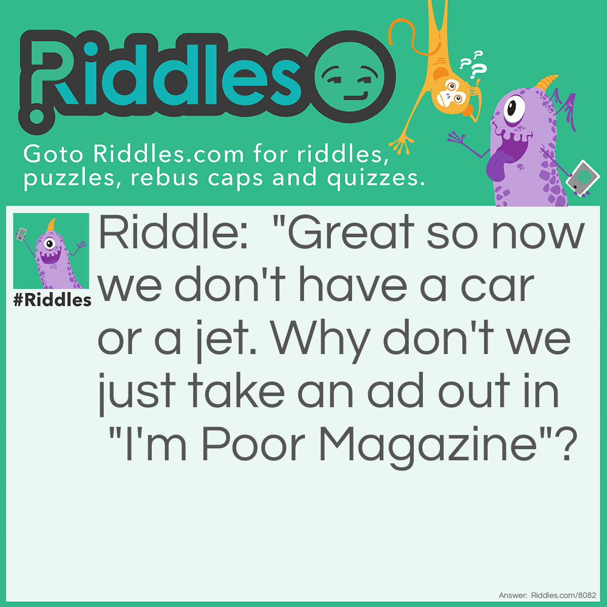 Riddle: "Great so now we don't have a car or a jet. Why don't we just take an ad out in "I'm Poor Magazine"?