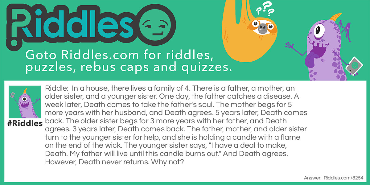 Riddle: In a house, there lives a family of 4. There is a father, a mother, an older sister, and a younger sister. One day, the father catches a disease. A week later, Death comes to take the father's soul. The mother begs for 5 more years with her husband, and Death agrees. 5 years later, Death comes back. The older sister begs for 3 more years with her father, and Death agrees. 3 years later, Death comes back. The father, mother, and older sister turn to the younger sister for help, and she is holding a candle with a flame on the end of the wick. The younger sister says, "I have a deal to make, Death. My father will live until this candle burns out." And Death agrees. However, Death never returns. Why not?