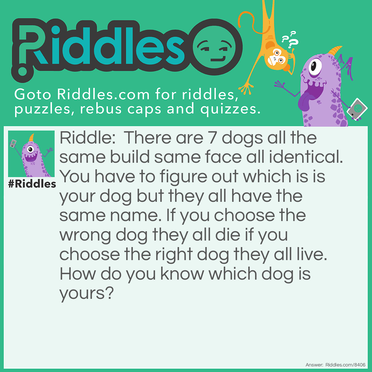 Riddle: There are 7 dogs all the same build same face all identical. You have to figure out which is is your dog but they all have the same name. If you choose the wrong dog they all die if you choose the right dog they all live. How do you know which dog is yours?