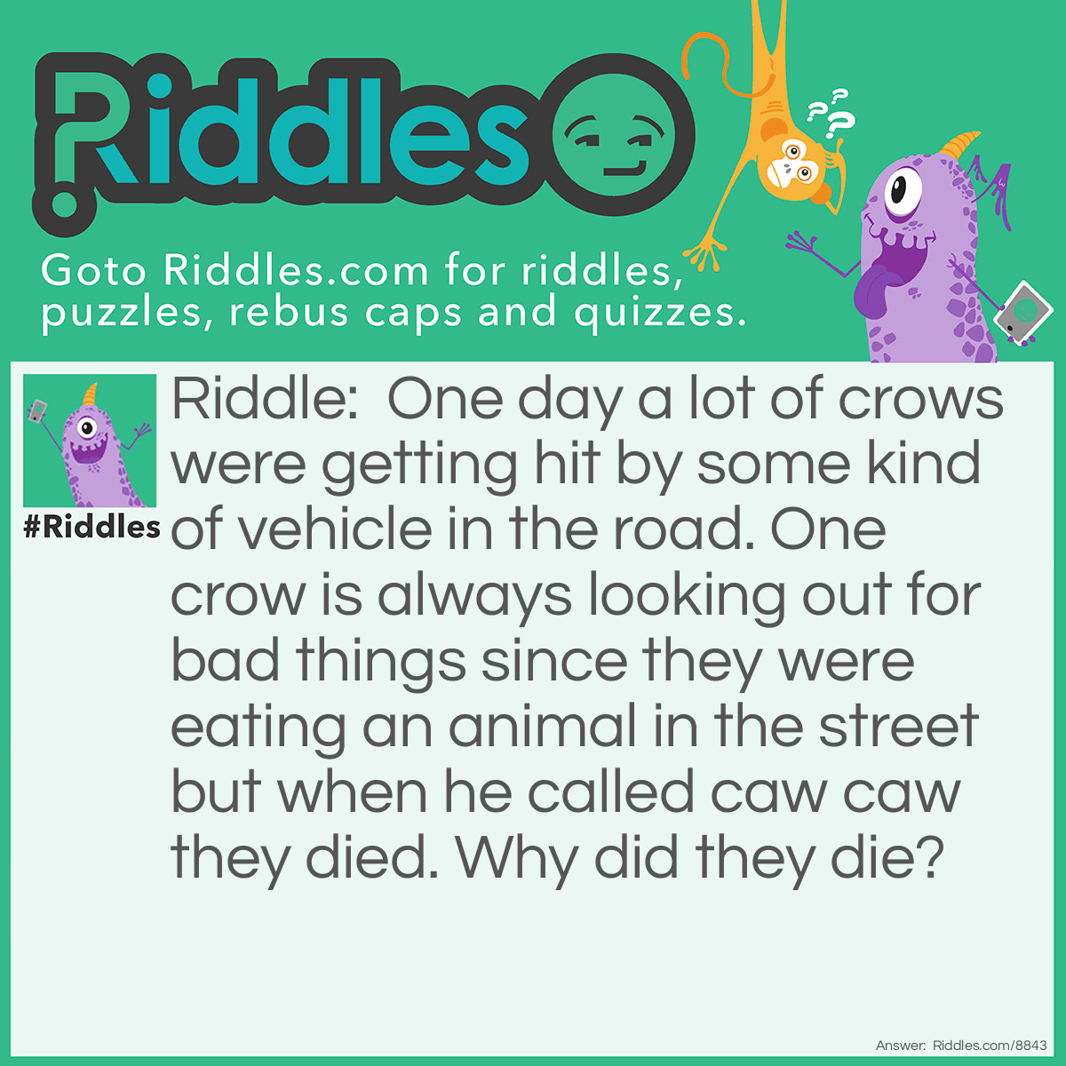 Riddle: One day a lot of crows were getting hit by some kind of vehicle in the road. One crow is always looking out for bad things since they were eating an animal in the street but when he called caw caw they died. Why did they die?