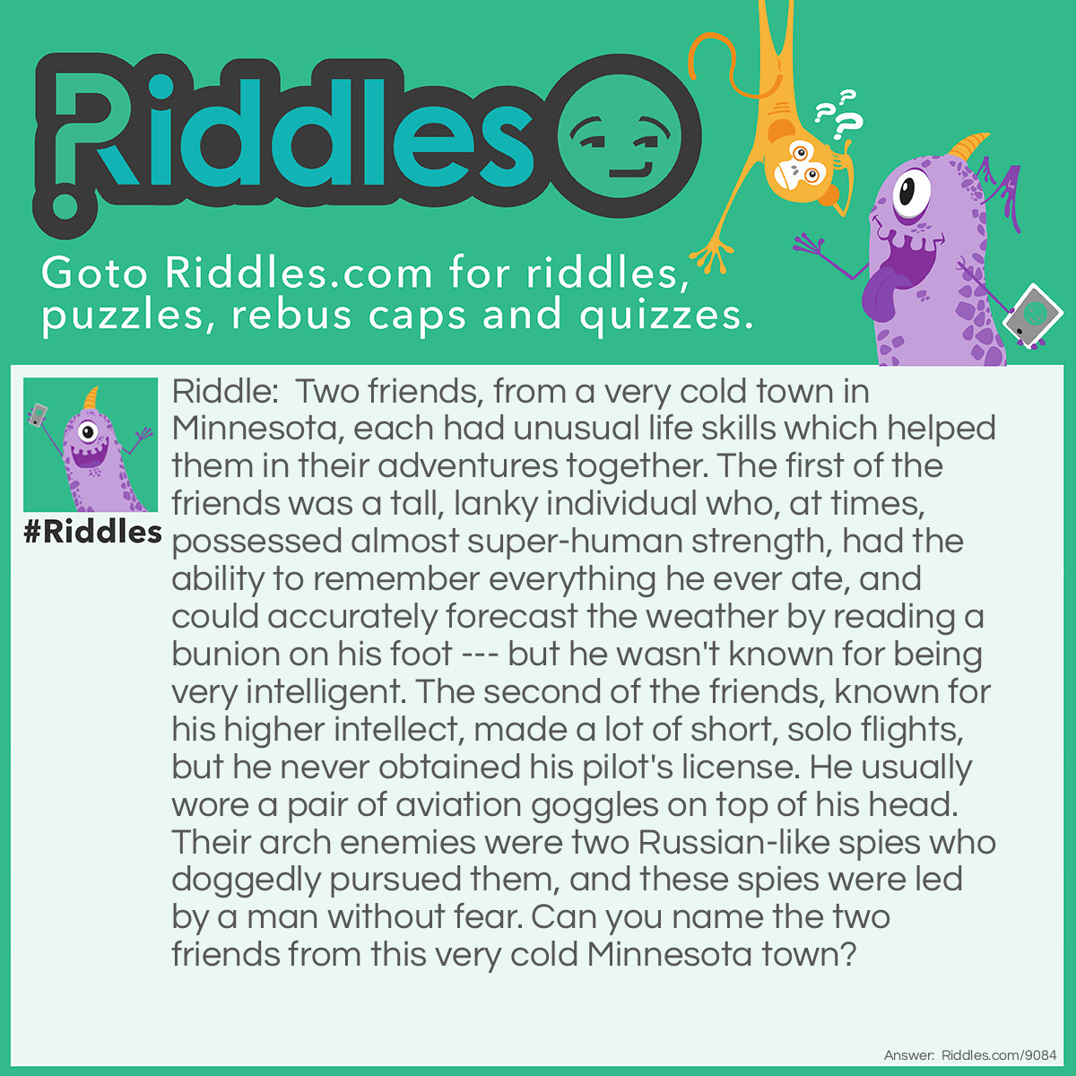 Riddle: Two friends, from a very cold town in Minnesota, each had unusual life skills which helped them in their adventures together. The first of the friends was a tall, lanky individual who, at times, possessed almost super-human strength, had the ability to remember everything he ever ate, and could accurately forecast the weather by reading a bunion on his foot --- but he wasn't known for being very intelligent. The second of the friends, known for his higher intellect, made a lot of short, solo flights, but he never obtained his pilot's license. He usually wore a pair of aviation goggles on top of his head. Their arch enemies were two Russian-like spies who doggedly pursued them, and these spies were led by a man without fear. Can you name the two friends from this very cold Minnesota town?