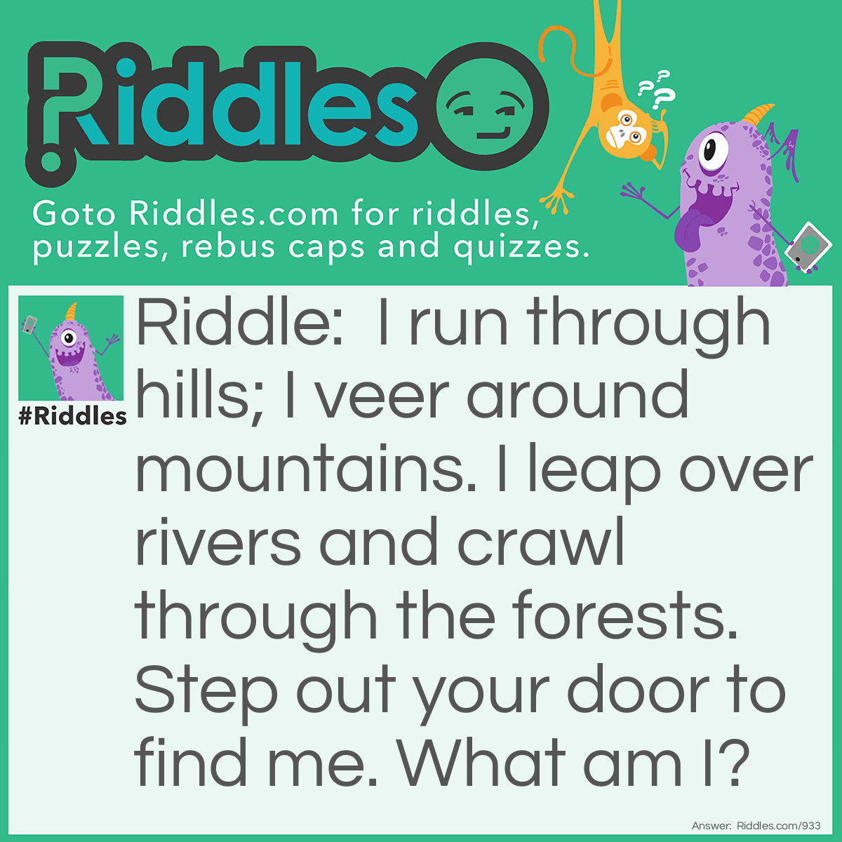 Riddle: I run through hills; I veer around mountains. I leap over rivers and crawl through the forests. Step out your door to find me.