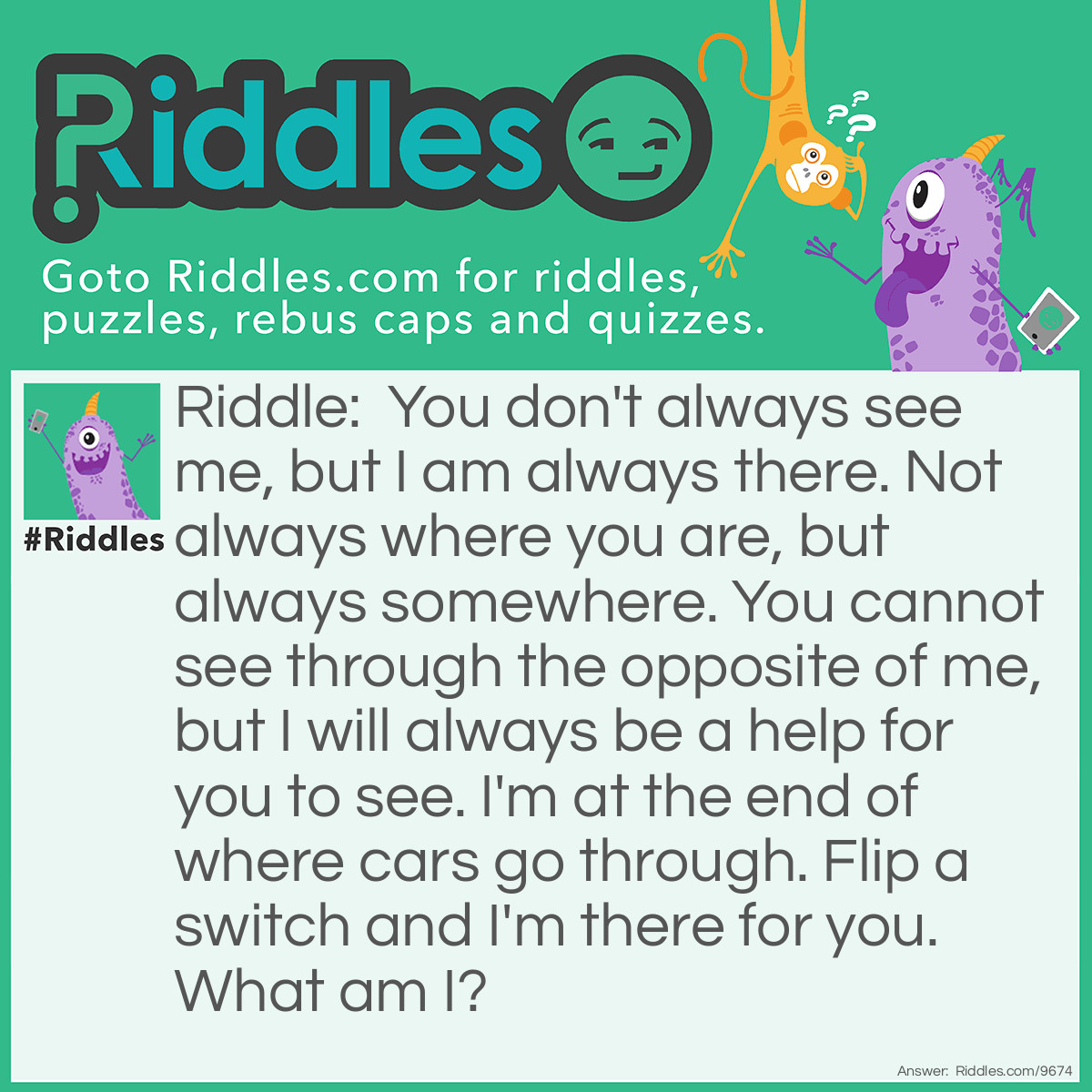 Riddle: You don't always see me, but I am always there. Not always where you are, but always somewhere. You cannot see through the opposite of me, but I will always be a help for you to see. I'm at the end of where cars go through. Flip a switch and I'm there for you. What am I?