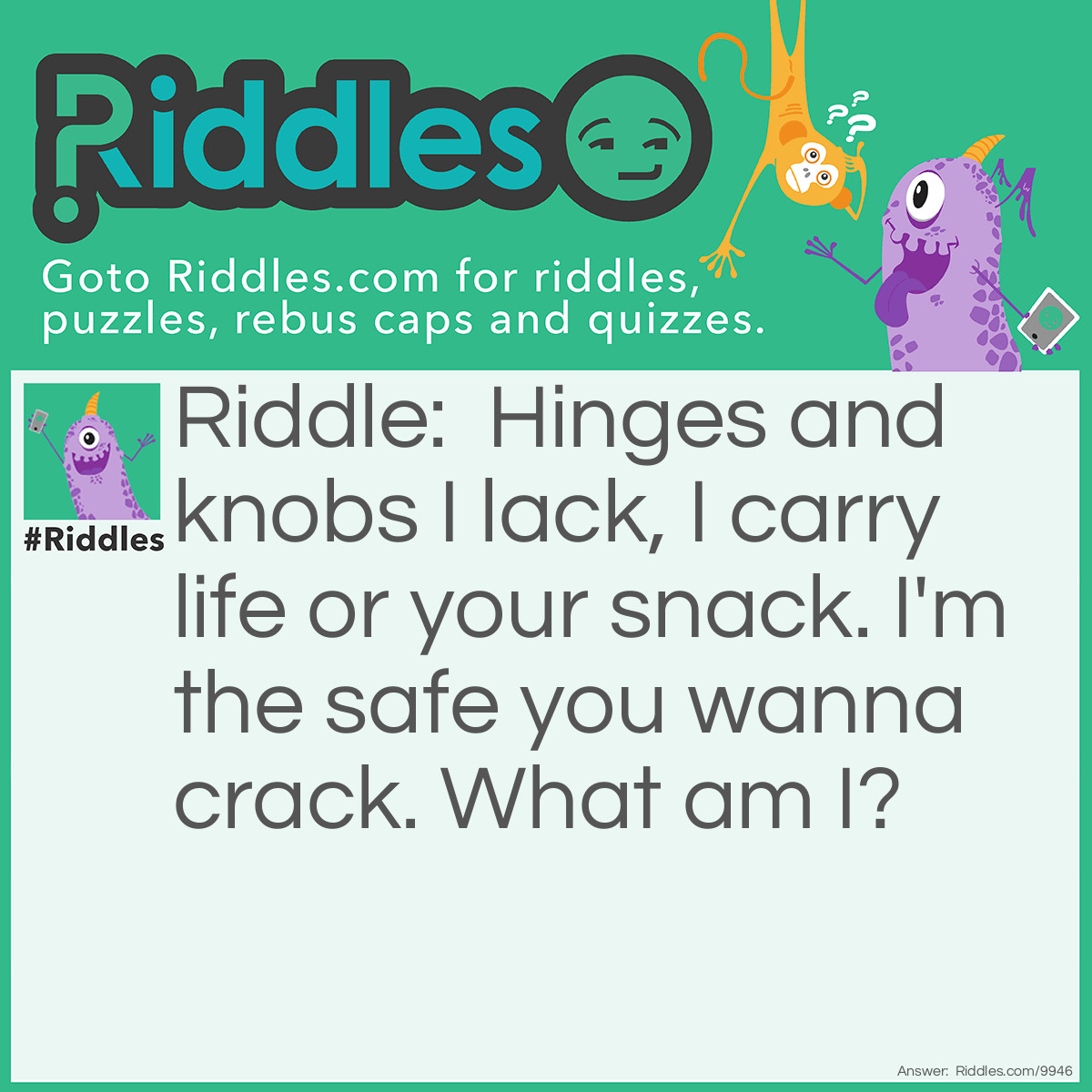 Riddle: Hinges and knobs I lack, I carry life or your snack. I'm the safe you wanna crack. What am I?