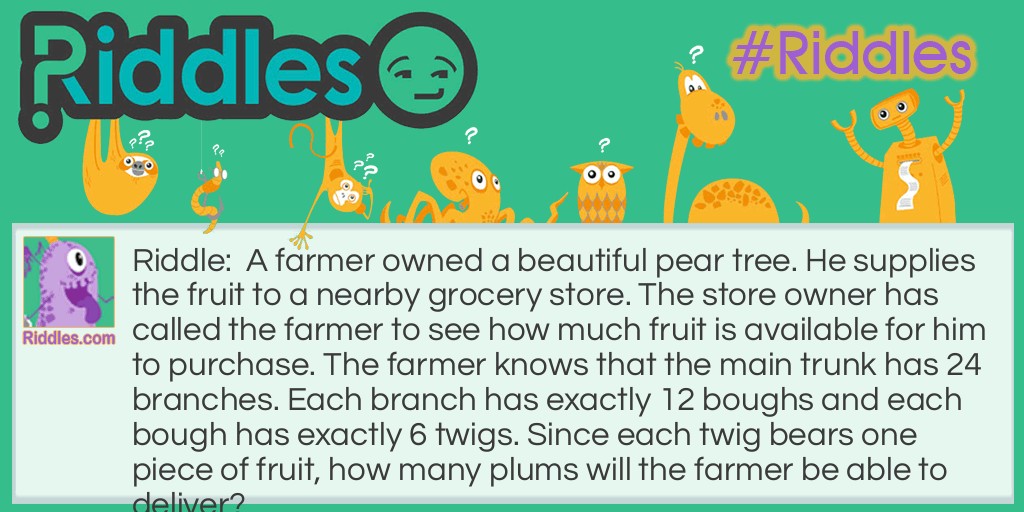 Riddle: A farmer owned a beautiful pear tree. He supplies the fruit to a nearby grocery store. The store owner has called the farmer to see how much fruit is available for him to purchase. The farmer knows that the main trunk has 24 branches. Each branch has exactly 12 boughs and each bough has exactly 6 twigs. Since each twig bears one piece of fruit, how many plums will the farmer be able to deliver?
