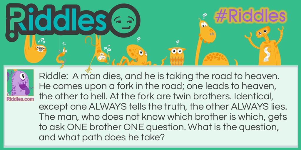 Riddle: A man dies, and he is taking the road to heaven. He comes upon a fork in the road; one leads to heaven, the other to hell. At the fork are twin brothers. Identical, except one ALWAYS tells the truth, the other ALWAYS lies. The man, who does not know which brother is which, gets to ask ONE brother ONE question. What is the question, and what path does he take?