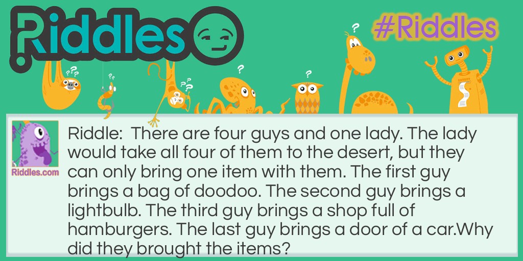 Riddle: There are four guys and one lady. The lady would take all four of them to the desert, but they can only bring one item with them. The first guy brings a bag of doodoo. The second guy brings a lightbulb. The third guy brings a shop full of hamburgers. The last guy brings a door of a car.