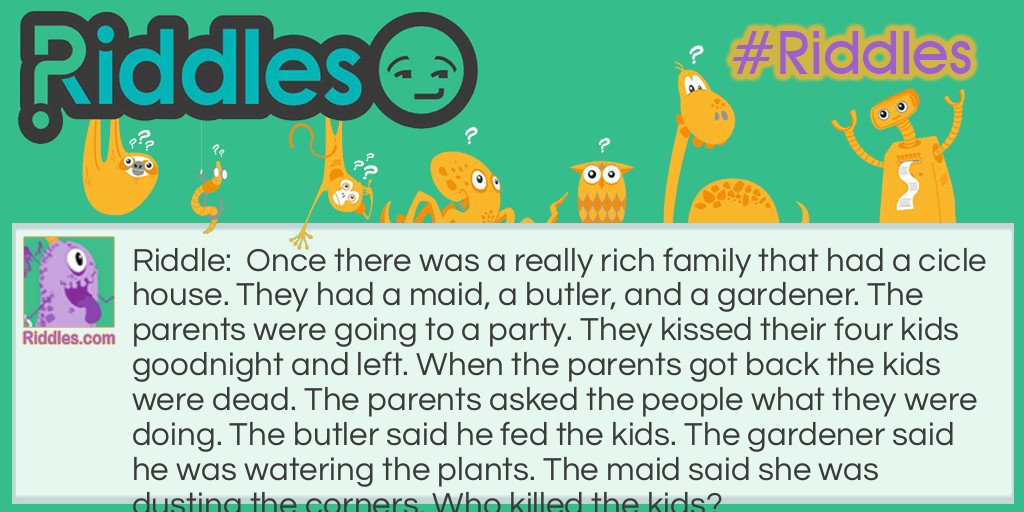 Riddle: Once there was a really rich family that had a circle house. They had a maid, a butler, and a gardener. The parents were going to a party. They kissed their four kids goodnight and left. When the parents got back the kids were dead. The parents asked the people what they were doing. The butler said he fed the kids. The gardener said he was watering the plants. The maid said she was dusting the corners. Who killed the kids?