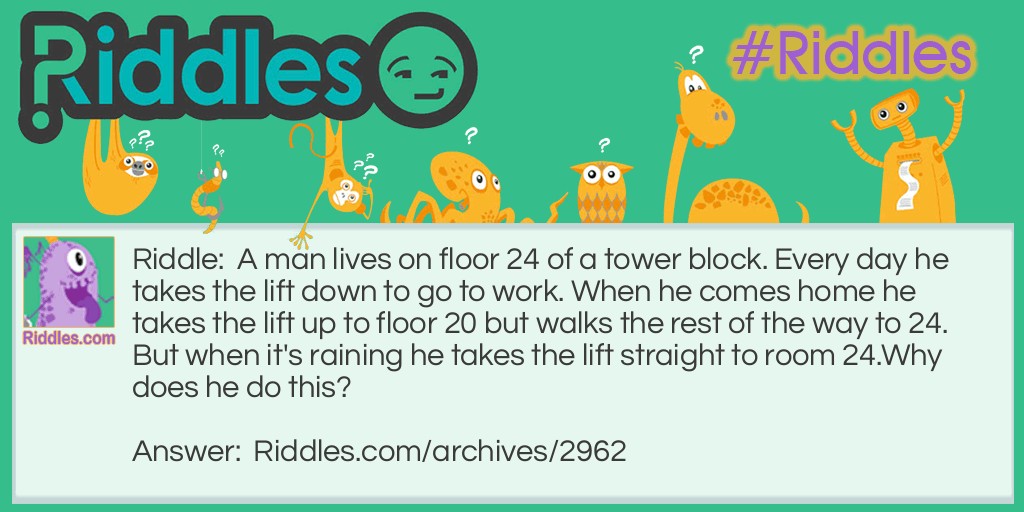 Riddle: A man lives on floor 24 of a tower block. Every day he takes the lift down to go to work. When he comes home he takes the lift up to floor 20 but walks the rest of the way to 24. But when it's raining he takes the lift straight to room 24.
