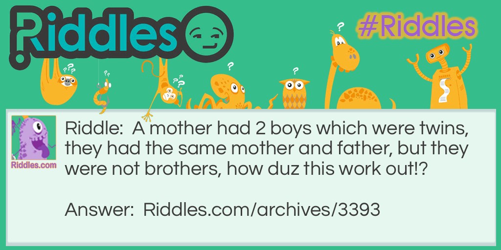 Riddle: A mother had 2 boys which were twins, they had the same mother and father, but they were not brothers, how duz this work out!?