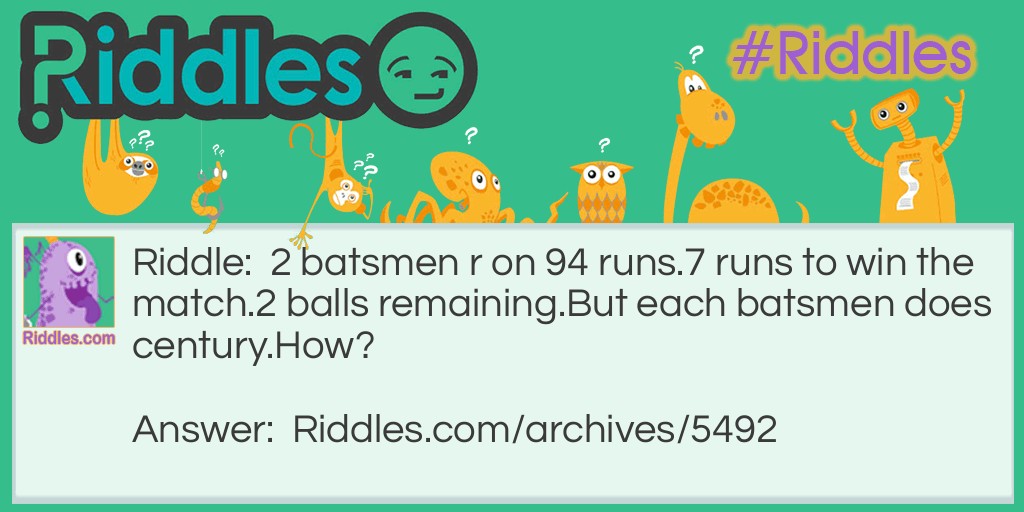 Riddle: 2 batsmen r on 94 runs.7 runs to win the match.2 balls remaining.But each batsmen does century.How?