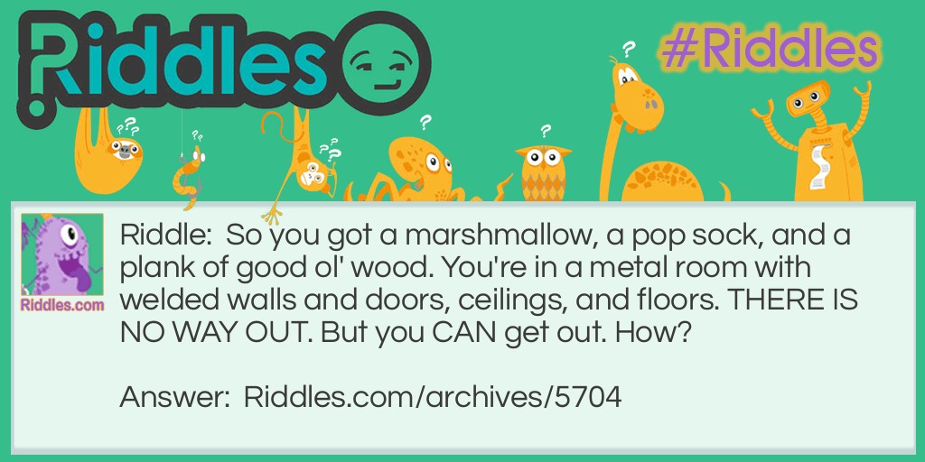 Riddle: So you got a marshmallow, a pop sock, and a plank of good ol' wood. You're in a metal room with welded walls and doors, ceilings, and floors. THERE IS NO WAY OUT. But you CAN get out. How?
