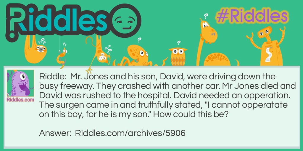 Riddle: Mr. Jones and his son, David, were driving down the busy freeway. They crashed with another car. Mr Jones died and David was rushed to the hospital. David needed an opperation. The surgen came in and truthfully stated, "I cannot opperatate on this boy, for he is my son." How could this be?