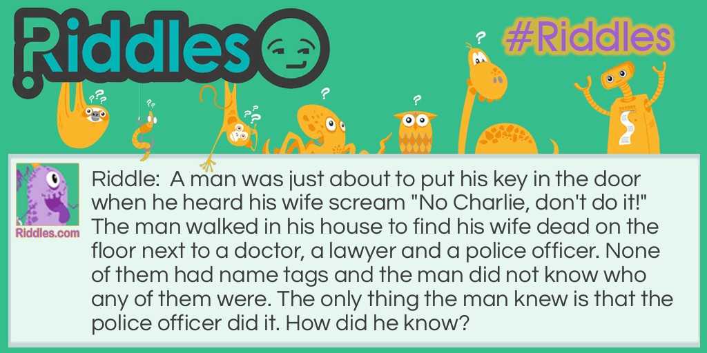 Riddle: A man was just about to put his key in the door when he heard his wife scream "No Charlie, don't do it!" The man walked in his house to find his wife dead on the floor next to a doctor, a lawyer and a police officer. None of them had name tags and the man did not know who any of them were. The only thing the man knew is that the police officer did it.