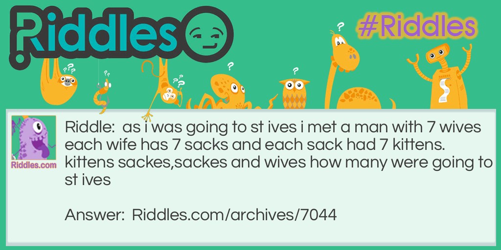 Riddle: as i was going to st ives i met a man with 7 wives each wife has 7 sacks and each sack had 7 kittens. kittens sackes,sackes and wives how many were going to st ives