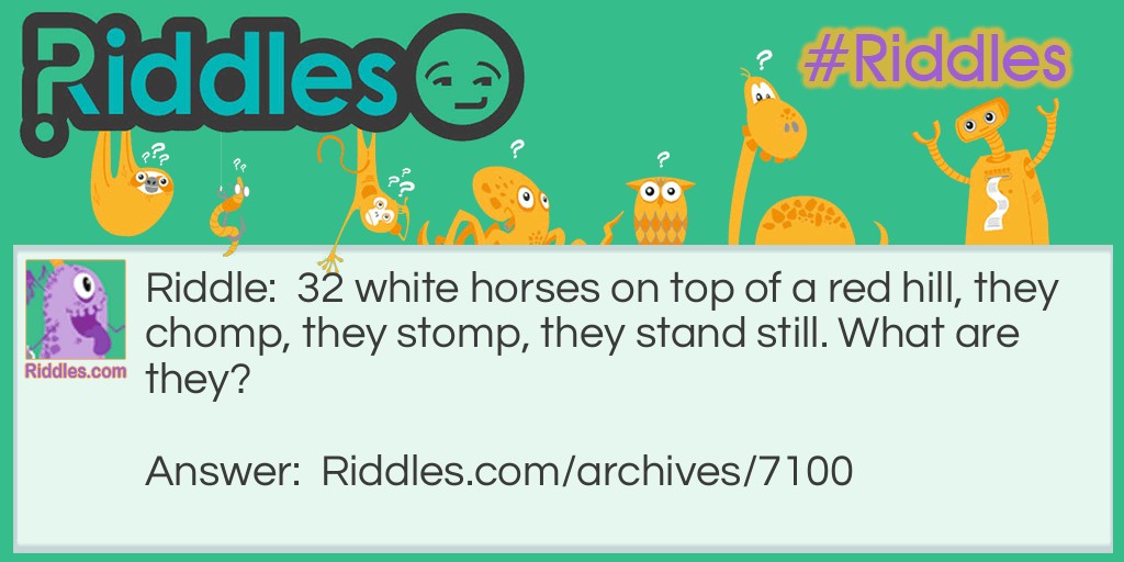 Riddle: 32 white horses on top of a red hill, they chomp, they stomp, they stand still. What are they?
