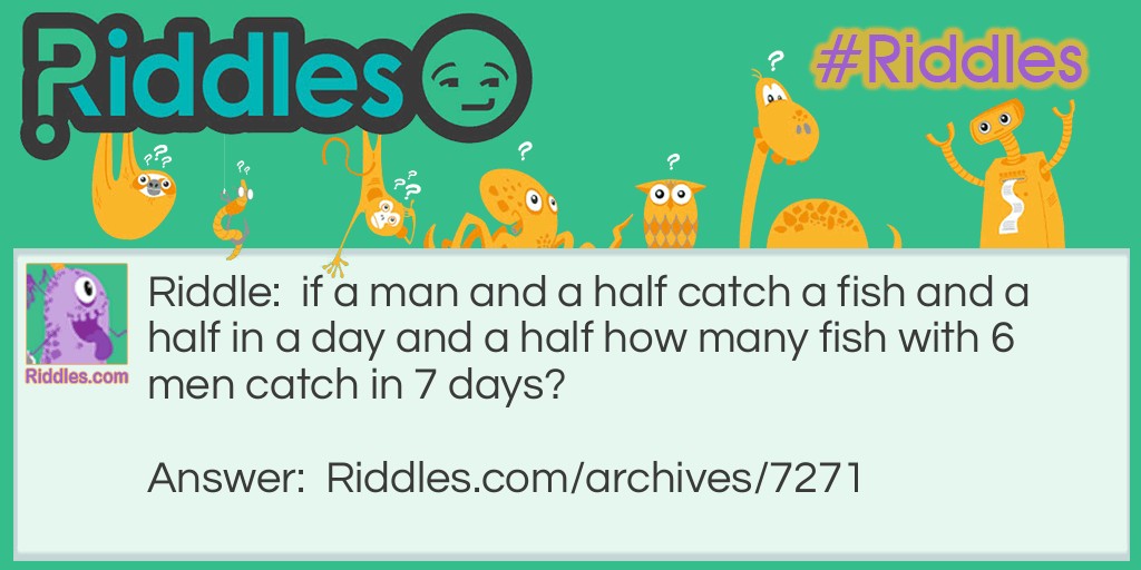 Riddle: if a man and a half catch a fish and a half in a day and a half how many fish with 6 men catch in 7 days?