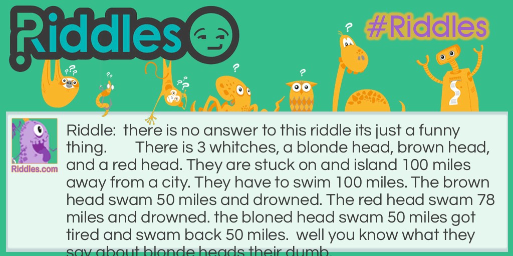 They have to swim 100 miles. The brown head swam 50 miles and drowned. The red head swam 78 miles and drowned. the bloned head swam 50 miles got tired and swam back 50 miles.