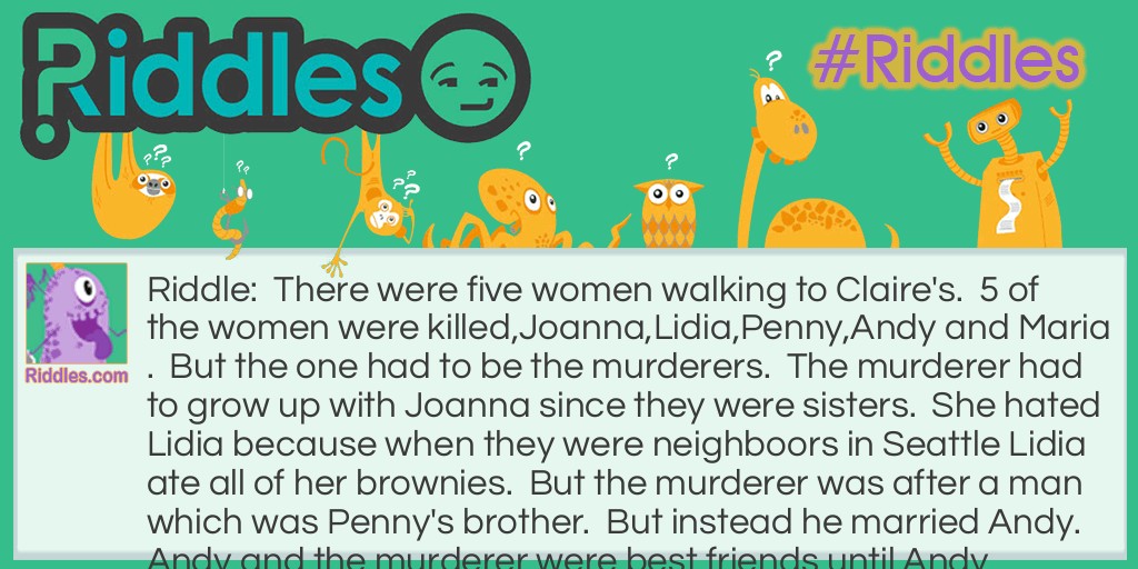 Riddle: There were five women walking to Claire's. 5 of the women were killed,Joanna,Lidia,Penny,Andy and Maria. But the one had to be the murderers. The murderer had to grow up with Joanna since they were sisters. She hated Lidia because when they were neighboors in Seattle Lidia ate all of her brownies. But the murderer was after a man which was Penny's brother. But instead he married Andy.Andy and the murderer were best friends until Andy married her guy.