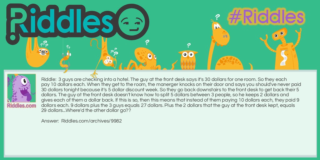 Riddle: 3 guys are checking into a hotel. The guy at the front desk says it's 30 dollars for one room. So they each pay 10 dollars each. When they get to the room, the manerger knocks on their door and says you should've never paid 30 dollars tonight because it's 5 dollar discount week. So they go back downstairs to the front desk to get back their 5 dollars. The guy at the front desk doesn't know how to split 5 dollars between 3 people, so he keeps 2 dollars and gives each of them a dollar back. If this is so, then this means that instead of them paying 10 dollars each, they paid 9 dollars each. 9 dollars plus the 3 guys equals 27 dollars. Plus the 2 dollars that the guy at the front desk kept, equals 29 dollars...Where'd the other dollar go??