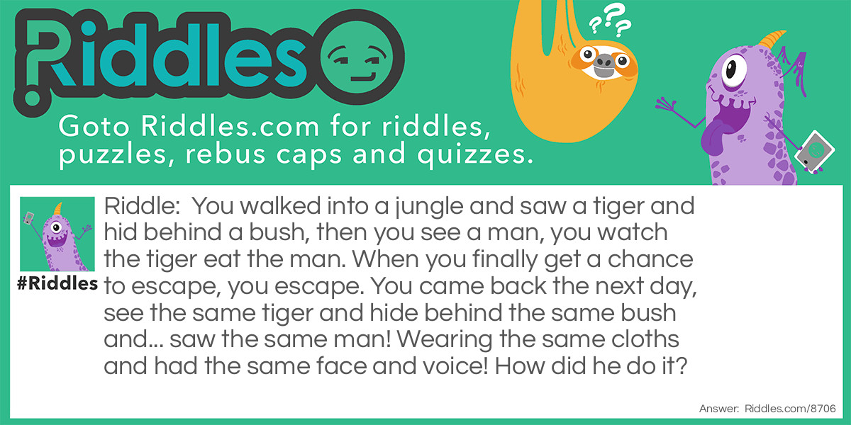 Riddle: You walked into a jungle and saw a tiger and hid behind a bush, then you see a man, you watch the tiger eat the man. When you finally get a chance to escape, you escape. You came back the next day, see the same tiger and hide behind the same bush and... saw the same man! Wearing the same cloths and had the same face and voice! How did he do it?